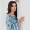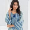 Sleeves: Full-length, wide sleeves with blue embroidered borders